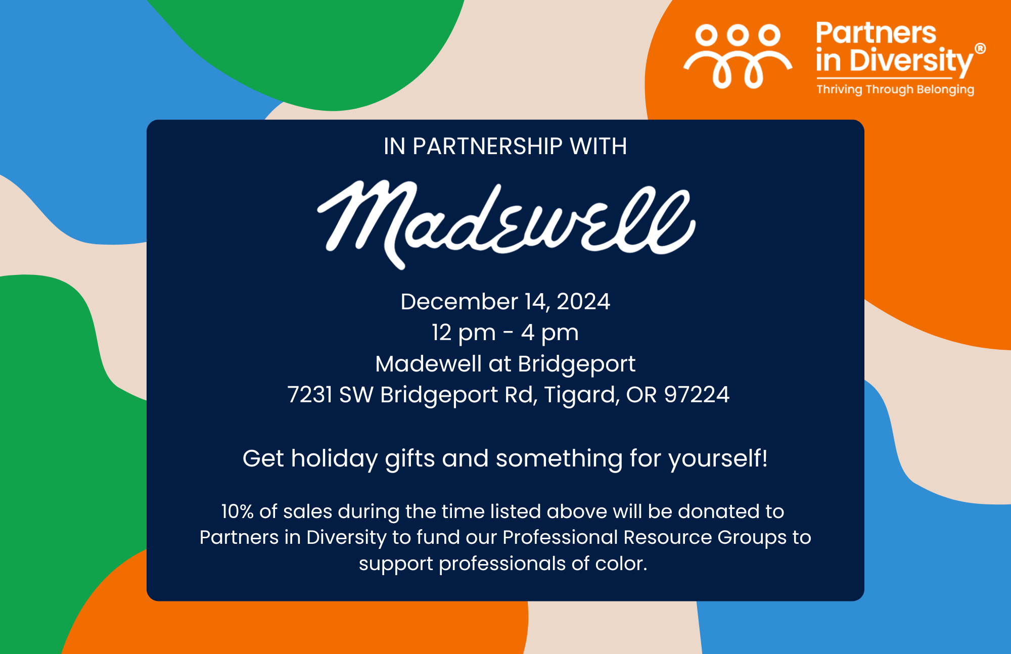 Shop at Madewell Partners in Diversity is excited to partner with Madewell this holiday season. Do your holiday shopping and get something nice for yourself on Saturday, December 14 from 12 pm to 4 pm at the Bridgeport Village store. 10% of all sales will be donated to Partners in Diversity to support and create community and belonging for professionals of color. |