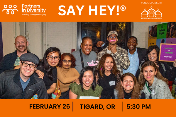 For this quarter's Say Hey!, we are partnering with Muslim Educational Trust. Say Hey! is the largest multi-cultural networking event in Oregon and southwest Washington. Each quarter, Partners in Diversity connects local businesses and community members with professionals of color who recently relocated to Oregon or southwest Washington. Recently relocated professionals of color, Honorees, are introduced during a special portion of the program.