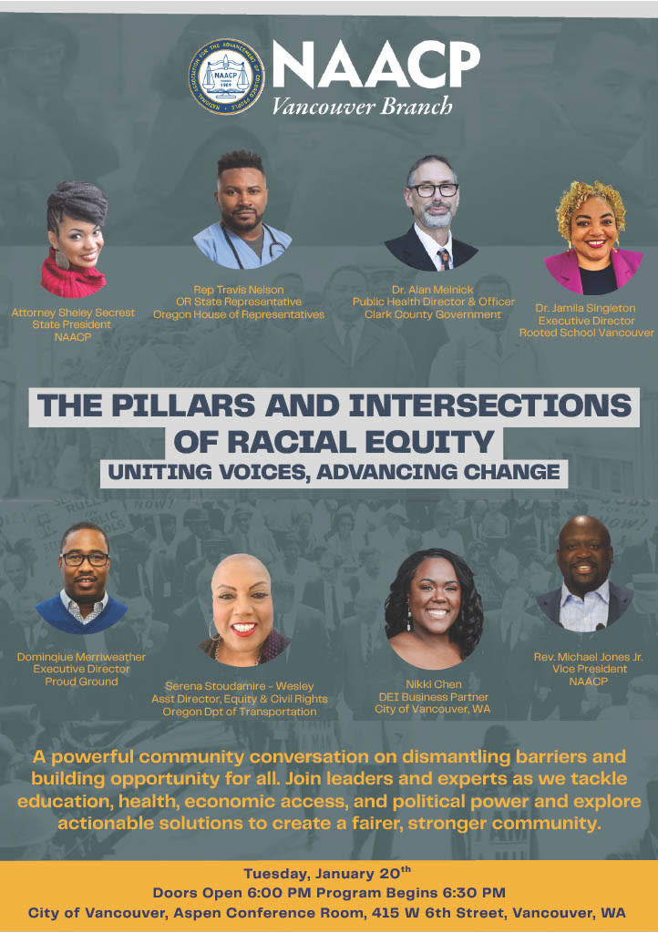 The NAACP Vancouver Branch invites you to a community conversation: The Pillars and Intersections of Racial Equity, an open and engaging discussion about advancing fairness, opportunity, and justice for all.